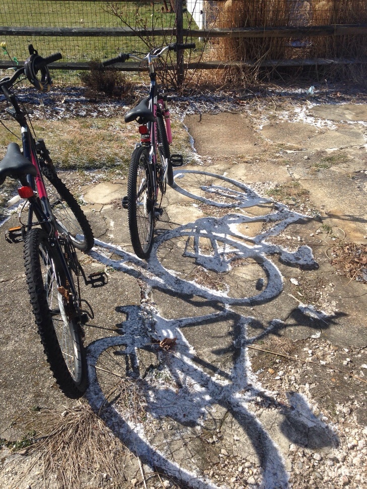 Сонце розтопило сніг всюди, крім тих місць, де лежала тінь від велосипеда