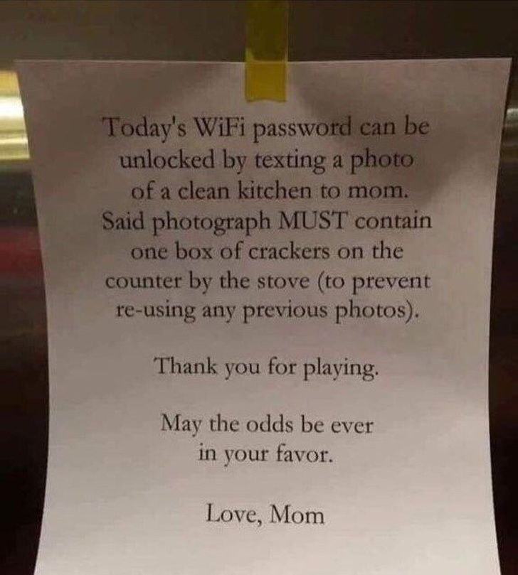«Щоб отримати пароль від Wi-Fi, надішліть мамі фото чистій кухні. На фото обов'язково повинна бути коробка крекерів на полиці біля плити (щоб ви не використовували старі фото). Спасибі за гру. І нехай удача завжди буде на вашому боці. З любов'ю, мама».