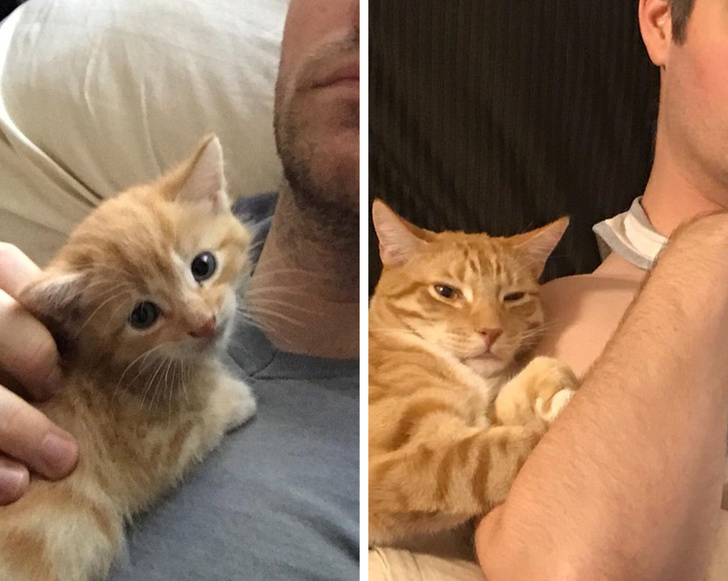 «Чоловік підібрав кошеня на вулиці. Навіть через рік малюк обожнює лежати на його плечі»