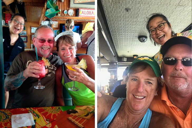 «2 роки тому була офіціанткою на торжестві у цієї пари і влізла до них на фото. Сьогодні ця ж пара прийшла вже в інший ресторан, де я тепер працюю, і ми, звичайно ж, зробили таке ж фото»