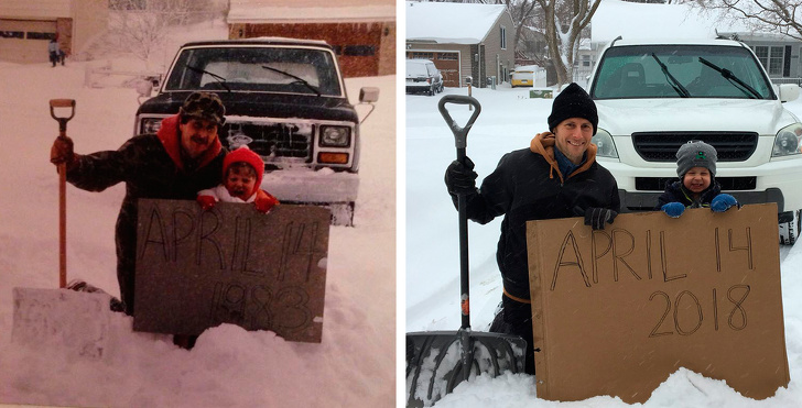 «Після такого ж сильного снігопаду ми з сином повторили фото, яке ми зробили з моїм батьком 35 років тому»