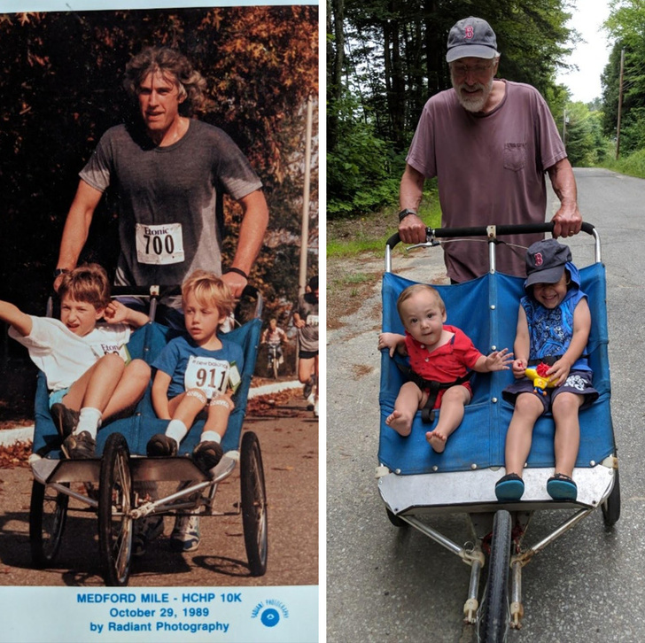«Зліва — мій тато везе мене з братом, справа — він же щастить моїх синів»
