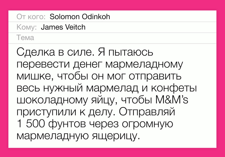 Звичайно, 1 500 фунтів Джеймс спамеру не відправив і на цій кульмінаційної ноті вирішив закінчити діалог