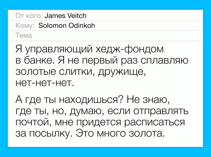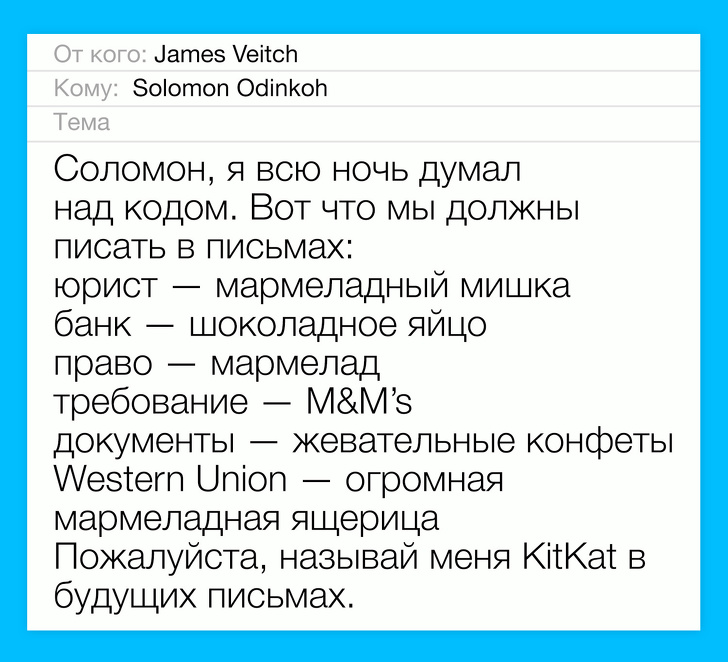 Джеймс Вейч (James Veitch) — письменник, який одного разу вирішив перевірити, що буде, якщо відповісти на листа зі спамом. Результат вийшов куди цікавіше, ніж можна було очікувати. Фінал цієї листування не зможуть передбачити навіть кращі голлівудські сценаристи.
