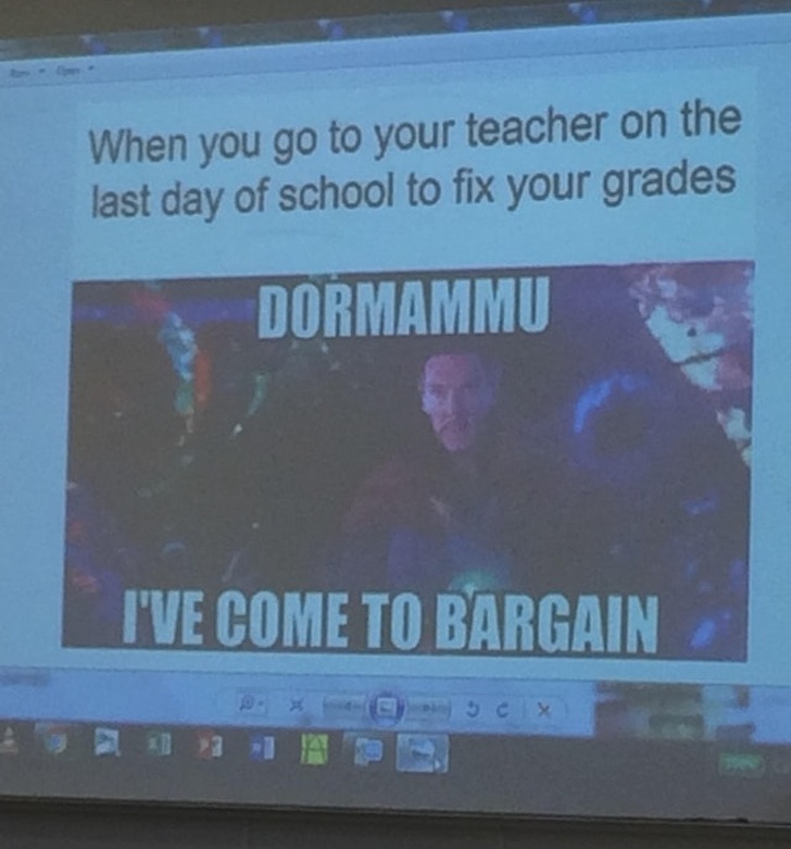 «Коли ти підходиш до вчителя в останній навчальний день і просиш поліпшити твої оцінки». «Дормамму, я прийшов домовитися».