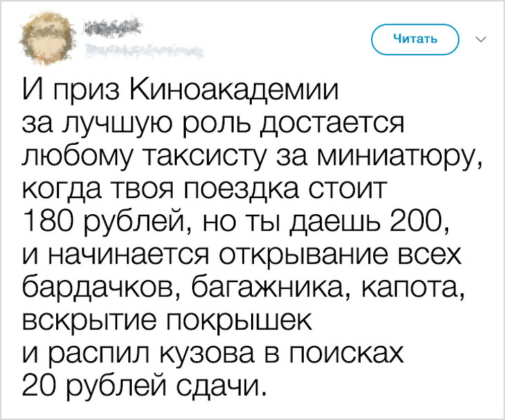 За що дають премію «Оскар» таксистам, як робити прибирання, не роблячи її, хто дивиться на ваші фото з відпустки тільки за гроші? Про все це пишуть люди, для яких будь-які недосконалості світу — привід написати смішний твіт. Не без крапельки отрути, зрозуміло.