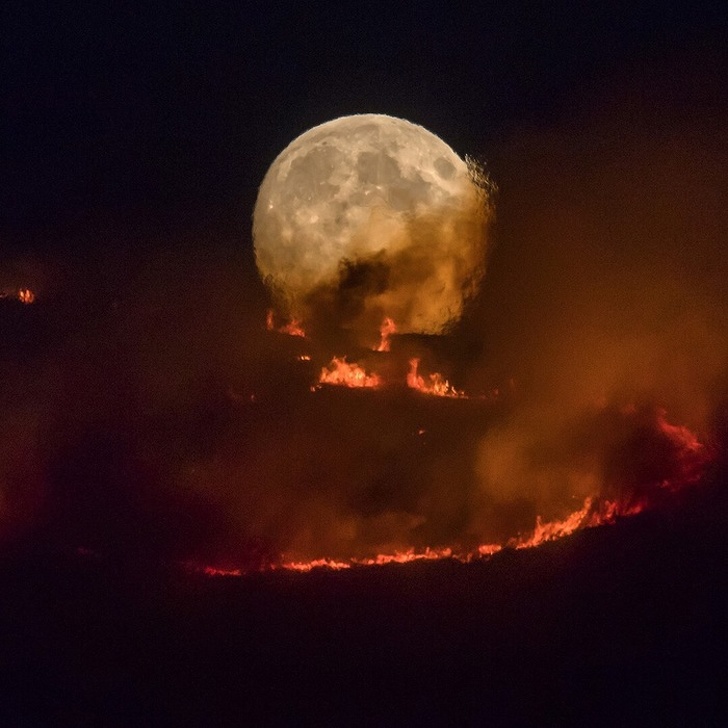 Повний місяць на тлі пожежі на верескових полях під Манчестером