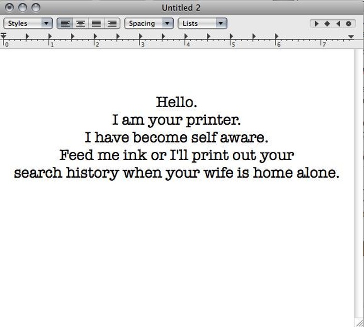 «Привіт. Я твій принтер. Я знайшов свідомість. Годуй мене чорнилом, інакше я відкрию твою історію браузера, коли твоя дружина буде одна вдома».