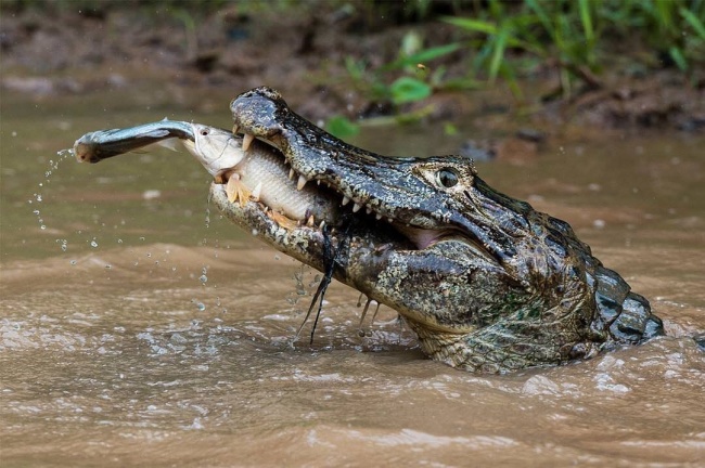 Кайман ловить тигрову рибу, яка ловить іншу рибу