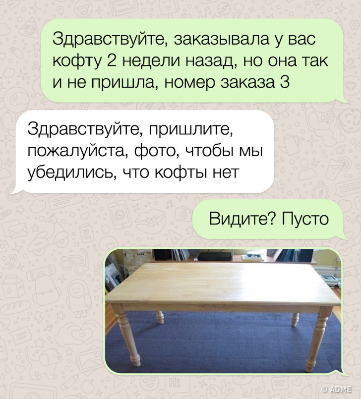 Як відомо, у суперечці істина може не тільки народитися, але і благополучно загубитися. Так відбувається і у СМС-переписці — стислому діалозі, в якому чого тільки не буває: іскрометний гумор, нещадна логіка і повне нерозуміння. Наприклад, в одному з повідомлень нашої добірки осіб зі служби підтримки просить незадоволеного покупця надіслати фото, які доводять, що товар не прийшов. Відповідь, безумовно, зробить ваш день.