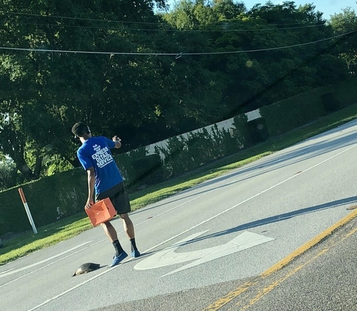 Хлопець допоміг черепасі перейти через дорогу, подаючи знаки автомобілів, щоб ті не наїхали на неї