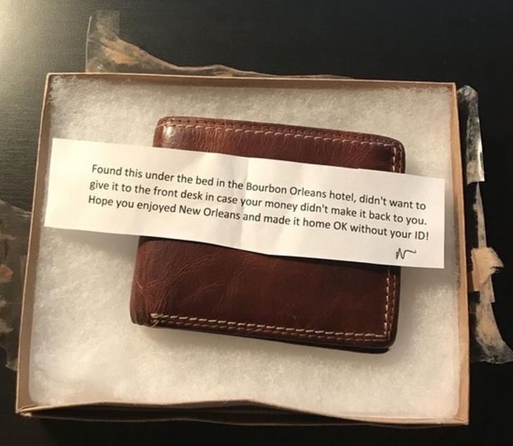 «Знайшов під ліжком в готелі. Вирішив не віддавати на ресепшен, тому що тоді ви напевно отримали гаманець без грошей. Сподіваюся, ви насолодилися подорожжю по Новому Орлеану і змогли дістатися додому без документів!»