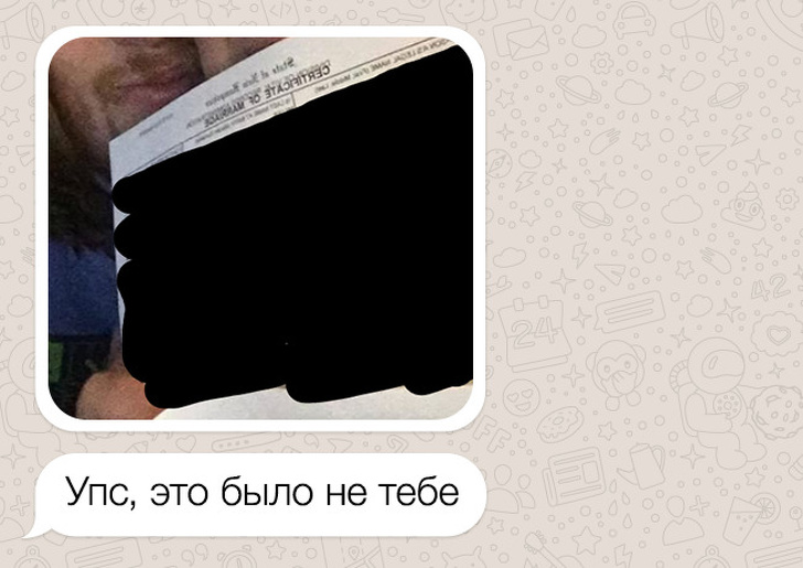 5. «Впевнений, що моя колишня абсолютно випадково прислала мені селфи зі своїм свідоцтвом про укладення шлюбу»