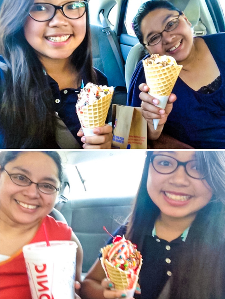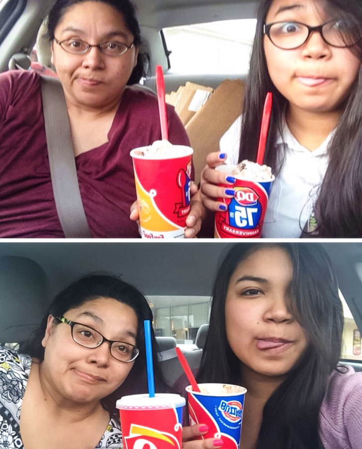 Зовсім недавно ця мила дівчина закінчила школу. За усталеною традицією вони з мамою повинні були відзначити цю подію в кафе і зробити спільну фотографію. Ось як виглядали знімки мами і доньки, які вони робили протягом 4 років: 1-й раз — у перший день школи, 2-й раз — в останній день занять.