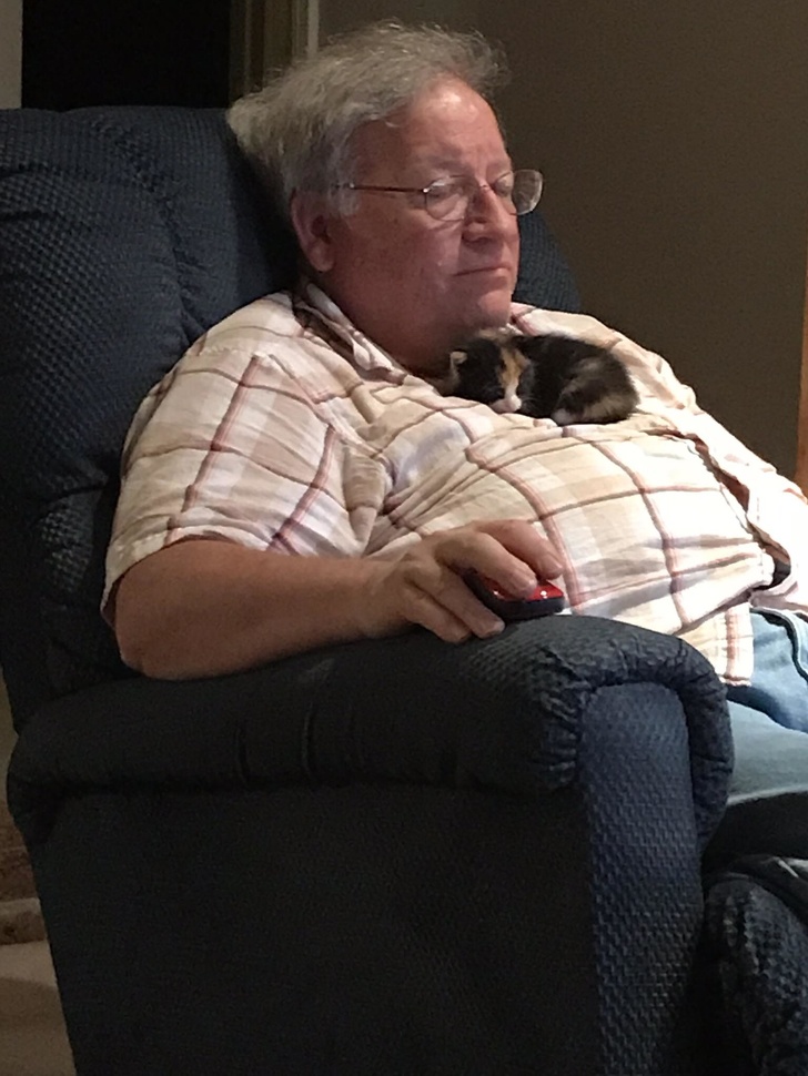 «У мого тата ніколи не було кота, але він обожнює грати з моїм, коли приходить в гості. Днями батько підібрав кошеня на вулиці. Тепер цей малюк спить ось так»