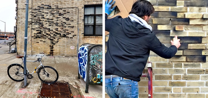 Вуличний художник робить вигляд, що цеглу в кладці будинків раскрошились у формі дерев