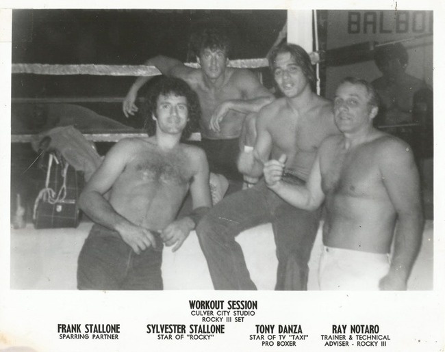 «Тоні Данца, Сильвестр і Френк Сталлоне і мій прадід (праворуч) після занять в спортзалі, 1979 рік»