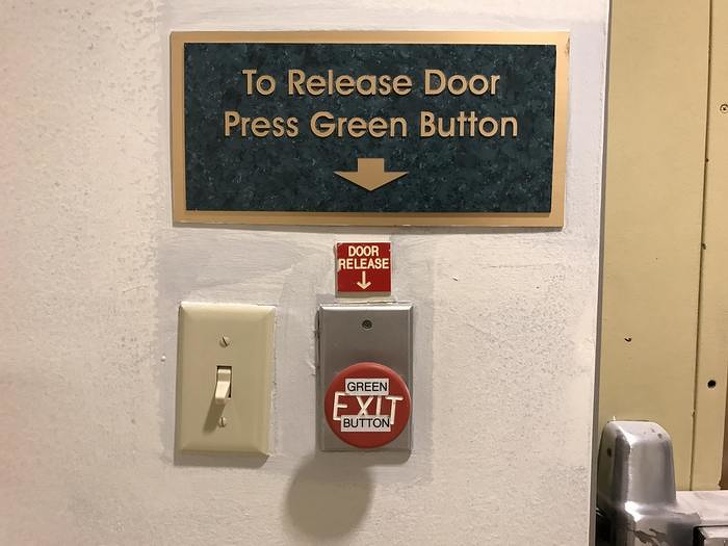 «Щоб відкрити двері, натисніть зелену кнопку. Напис на кнопці: «Зелена кнопка».