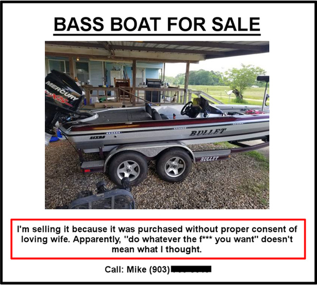 «Я продаю катер тому, що він був куплений без належної згоди люблячої дружини. По всій видимості „Роби що хочеш!“ зовсім не означає те, що я думав».