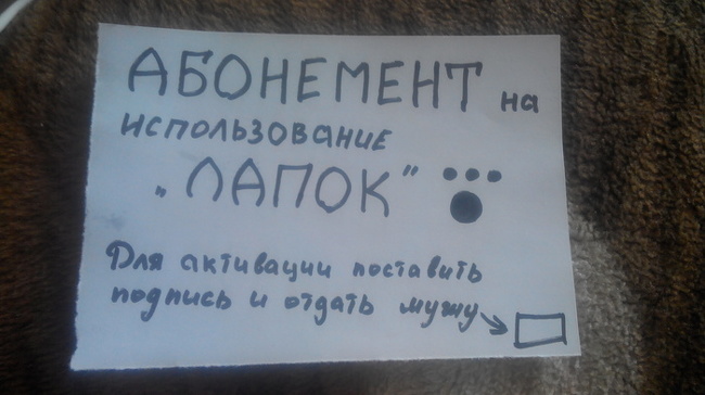 «Чоловік іноді дарує мені ось такий абонемент. Це означає, що я можу сказати: „У мене лапки“ і цілий день нічого не робити»
