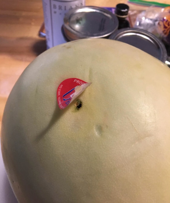 Спритний продавець вирішив замаскувати диню, поеденную хробаком, за допомогою стікера
