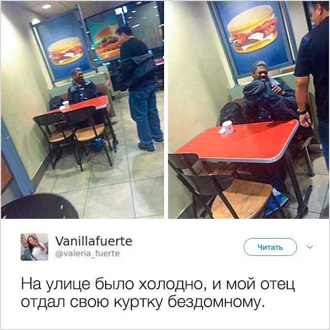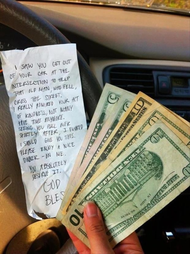 «Я бачив, як ви вийшли з машини, щоб допомогти старому чоловікові, який впав, перетнути вулицю. Мене вразив ваш вчинок, адже деякі люди вчинили б так само. І я вирішив, що повинен дати вам це. Насолоджуйтеся приємною вечерею — за мій рахунок. Ви це заслужили».