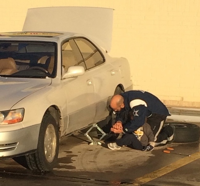 Вчить свого сина міняти колеса в машині