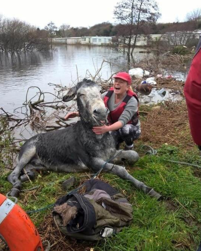 Ослик, врятований від повені, посміхається своїм рятувальникам