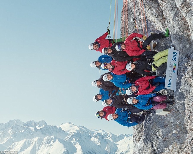 18. Альпіністи позують на стрімкому схилі гори