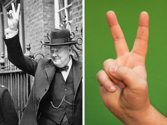 Жест «вікторі» має цікаву історію. У Середні століття полоненим лучникам відрубували саме ці два пальці на правій руці, щоб вони більше ніколи не могли стріляти. Лучники, знаючи про це, перед битвою дражнили ворога, показуючи їм неушкоджені пальці, — жест мав відверто образливий характер. Зараз він його втратив і означає лише світ, перемогу. Його поширенню чимало посприяв Уїнстон Черчілль. Крім того, жест став одним з символів руху хіпі, завдяки яким його знає весь світ. Адже кому як не переконаним пацифістам демонструвати знак «світ».