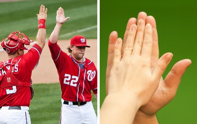 Жест «дай п'ять» прийшов зі спорту. Вважається, що він вперше з'явився на бейсбольному матчі в 1977 році. Два гравці розіграли вдалу комбінацію, один з них захоплено підняв руку над головою. Другий, не здогадуючись, що йому робити, просто вдарив по його долоні. Яскравий жест сподобався вболівальникам і пішов в маси. В США навіть існує день привітання «Дай п'ять», який відзначається в третій четвер квітня.