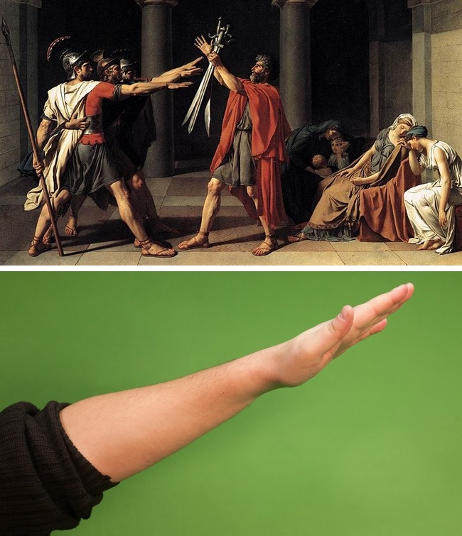 Жест, який в наші дні міцно асоціюється з нацизмом, насправді має багатовікову історію. Вважається, що цим жестом імператори і воєначальники вітали своїх легіонерів. Сучасна варіація римського салюту отримала популярність завдяки картині Жака-Луї Давида «Клятва Гораціїв».