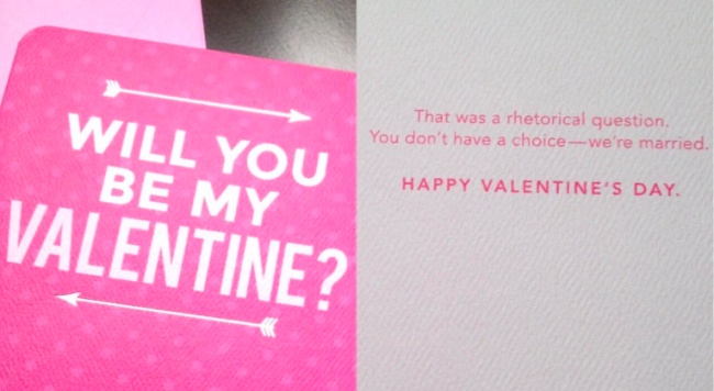 «Будеш моєю валентинкою? Це риторичне питання. У тебе немає вибору: ми одружені. З Днем святого Валентина!»