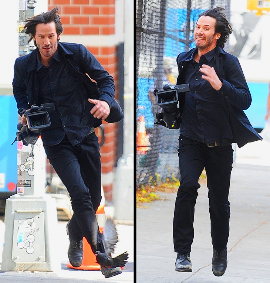 Кіану Рівз краде камеру і тікає від погоні на зйомках фільму «Троє в Нью-Йорку», 2010 р.