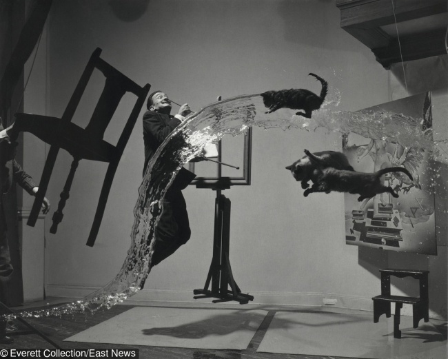 Фотографія, яку зараз можна з легкістю «нафотошопить» за півгодини, в далекому 1948 році вимагала для свого створення цілих 6 годин. Фотограф Філіп Халсман був хорошим другом Сальвадора Далі і з задоволенням підтримав творчу ідею одного. Мольберт і картина були підвішені на нитці до стелі, стілець тримала асистентка, Дали стрибав, кішки стрибали, воду плескали і витирали — і так 28 разів.