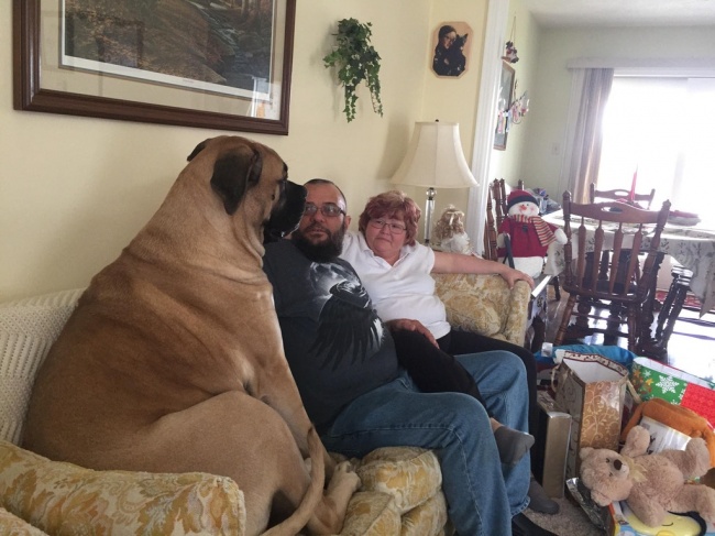 «Наш 97-кілограмовий англійський мастиф Медді відпочиває на дивані разом з моїм батьком і мачухою»