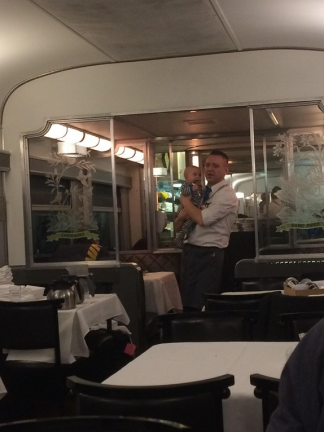 Співробітник залізниці доглядає за малюком, поки його мама їсть