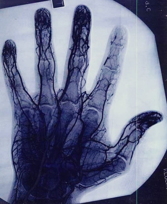 Ця ангіограма показує пошкодження судин вказівного пальця майстра гри з йо-йо