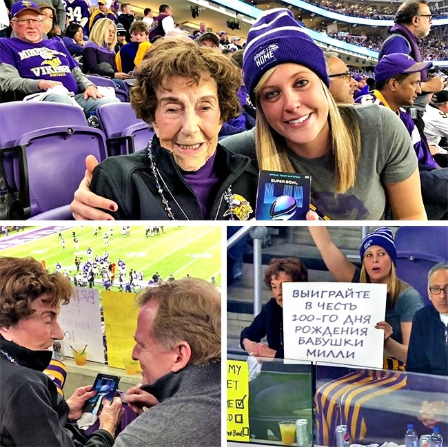 «На свій 100-й день народження моя бабуся Міллі хотіла сходити на футбольний матч, в якому грали її улюблені „Вікінги“. Нам подарували 2 квитка»