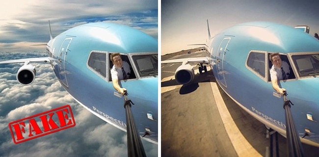 Фото безстрашного пілота, який робить неймовірне селфи прямо в польоті, так розбурхав громадськість, що породило навіть цілу низку наслідувачів. Правда, деякі з них, навіть зізнався в обмані, збирають десятки тисяч лайків. Безперечно, кадр виглядає ефектно, але все ж це підробка. При цьому навіть оригінальний кадр виглядає дуже круто і гідний багатьох лайків і репостов.