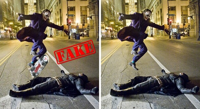 Це фото поширилося в інтернеті завдяки твіттеру. Підпис повідомляла, що саме так Хіт Леджер розважався на зйомках "Темного лицаря". Неймовірне твердження було легко прийнято інтернет-спільнотою і досі тиражується в різних соціальних мережах. Насправді це фотомонтаж.