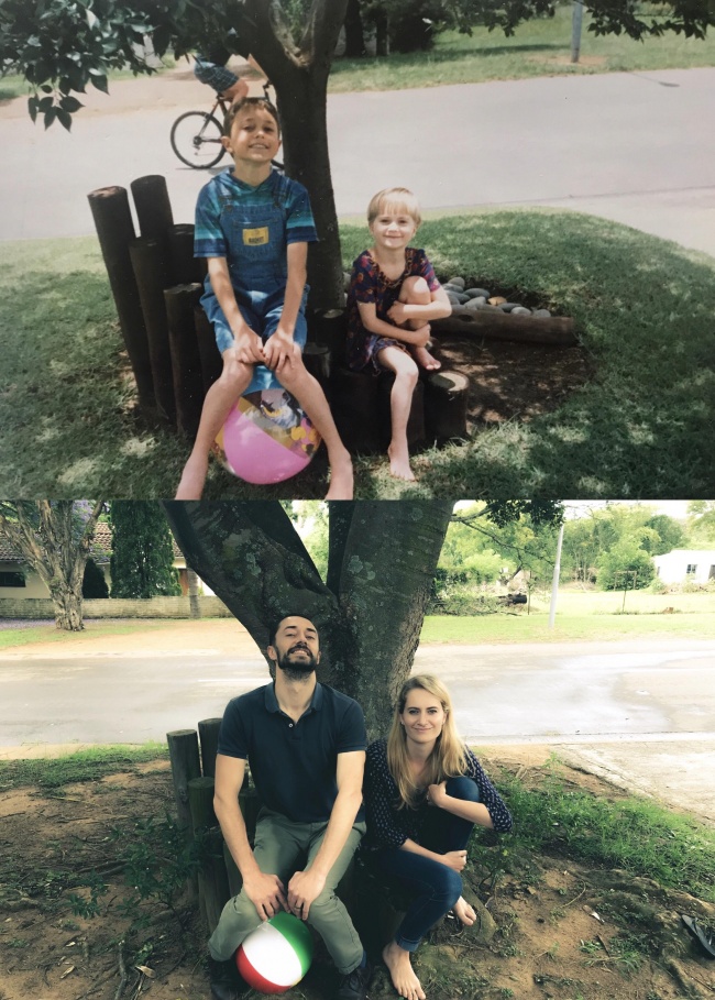 «22 роки різниці. Під час візиту в містечко, де пройшло наше дитинство, ми виявили, що пеньки біля нашого колишнього будинку досі стоять на місці. А ось дерево здорово зросла».