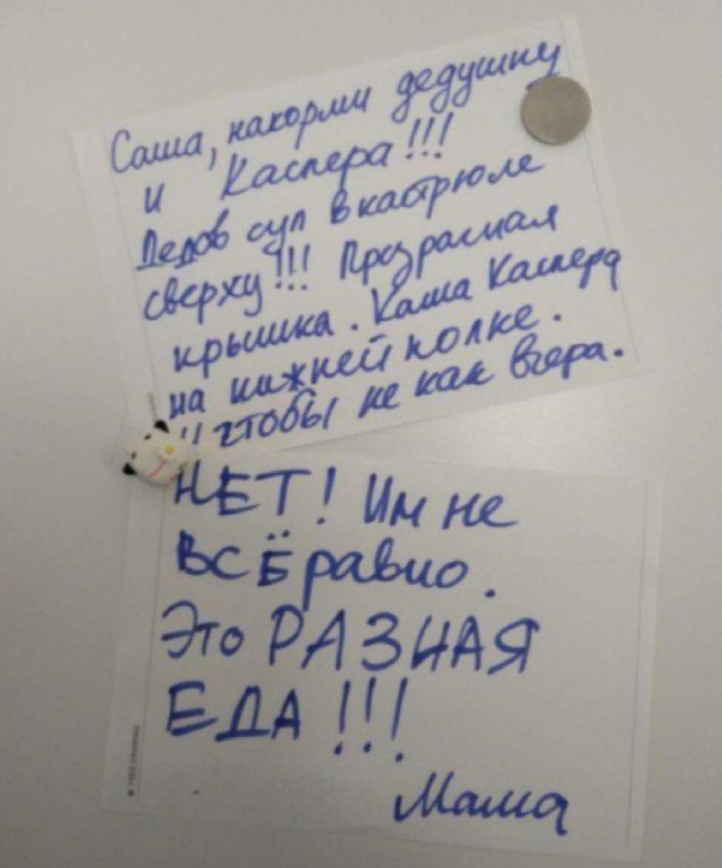 - Маму поклали в лікарню на два тижні. Перед відльотом вона одного з дрібних братів одягла у светр, ну і залишила всіх дітей з батьком. Через два тижні повертається додому і бачить картину маслом: малої в тому ж самому светрі, тільки вже брудному, затасканном, зі слідами засохлого супу та іншої їжі. Вона відразу на батька гнати, мовляв, ти чого, за дітьми взагалі стежиш? А він у відповідь: стежу, стежу. Ти спробуй з нього зняти цей светр, він відразу в рев і повторює: «Мама одягла, мама і зніме...»