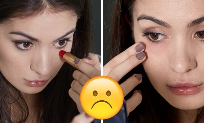 На наш погляд, даний рада явно не виправдовує себе. Мало того що ви точно не замаскируете синці (потрібно буде нанести кілька шарів консилера, щоб хоч якось перекрити червоний колір), потім вам знадобиться ще не одна волога серветка, щоб видалити помаду з-під очей.