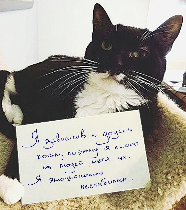 «Я заздрий до інших котів, тому писаю на людей, цілячись їх. Я емоційно нестабільний»