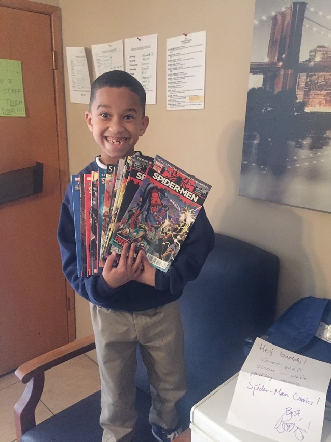 Хлопчик — фанат коміксів про Людину-павука, і він отримав подарунок від одного з творців коміксу, Брайана Майкла Бендиса. Так автор вирішив підбадьорити малюка, який потрапив в автомобільну аварію.