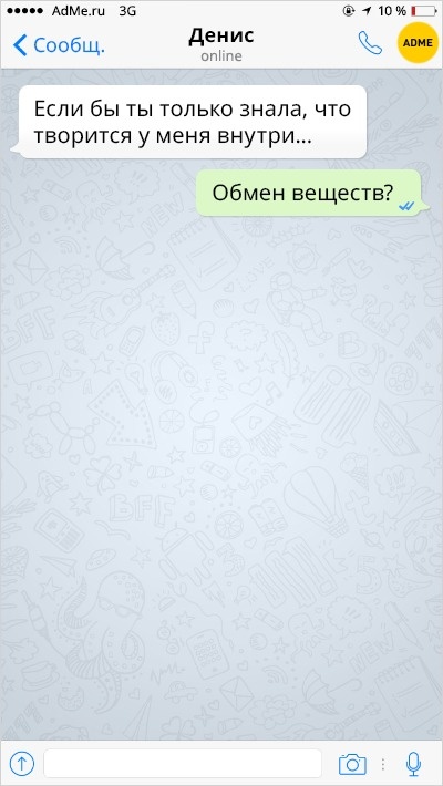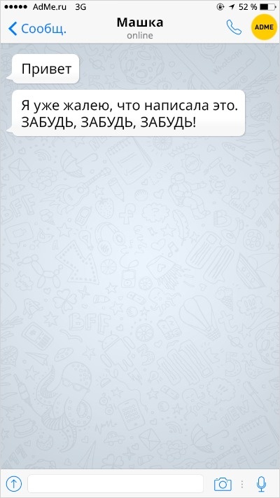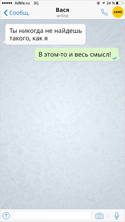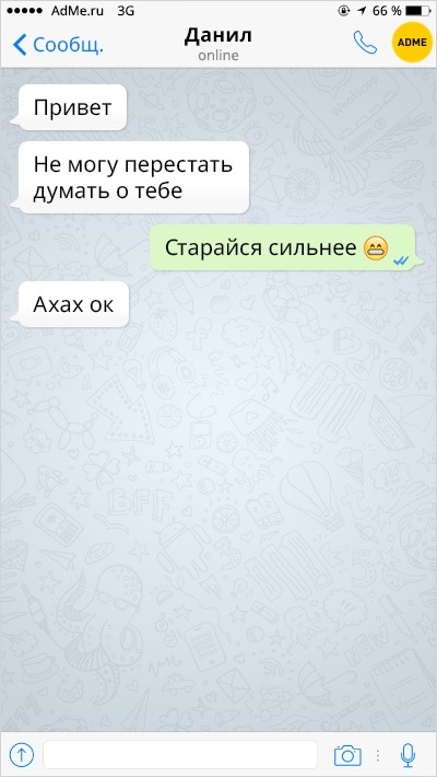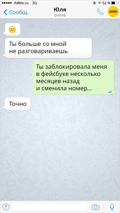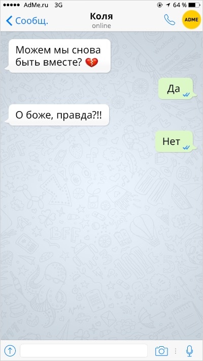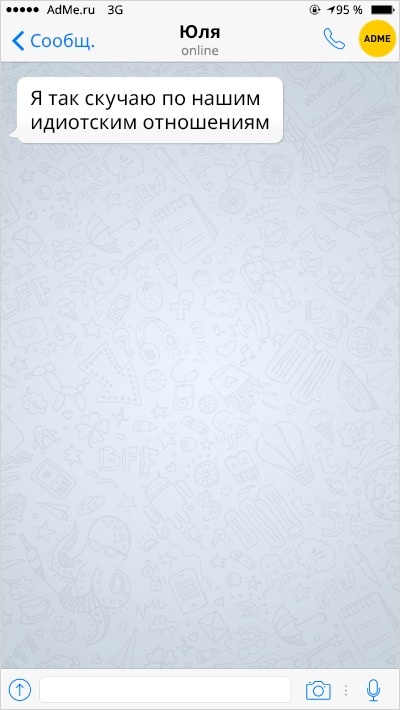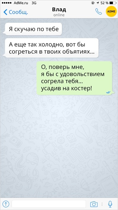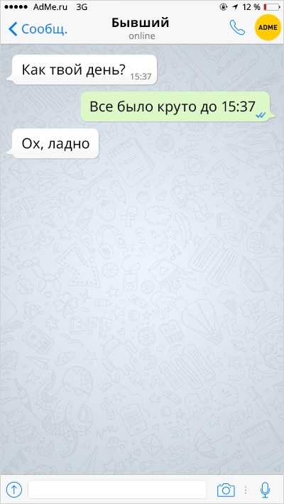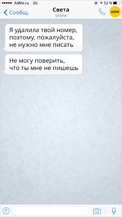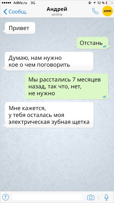 Ох вже ця любов-морква: перш ніж зустріти того самого людини, ми обжигаемся і розлучаємося з кимось іншим. А вже есемески від колишніх хлопців і дівчат — це окрема повість, повна саркастичных подколи і жартів.