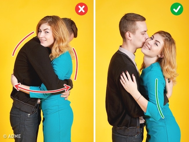 В бажання обійняти партнера не навалюйтеся на нього всім тілом і не нахиляйтеся сильно вперед. Також невірно класти руки на плечі повністю. Встаньте трохи ззаду і злегка нахиліться до партнера. Покладіть руки лагідно на плечі, намагатися з'єднати їх не потрібно.