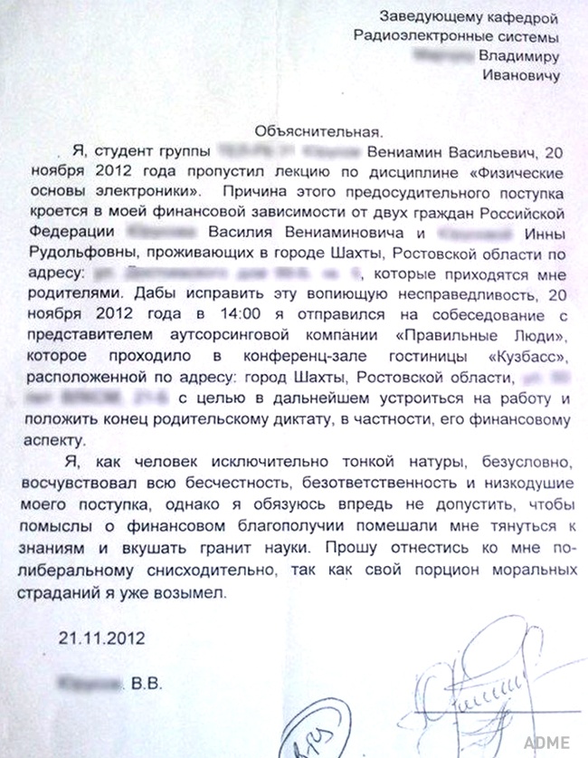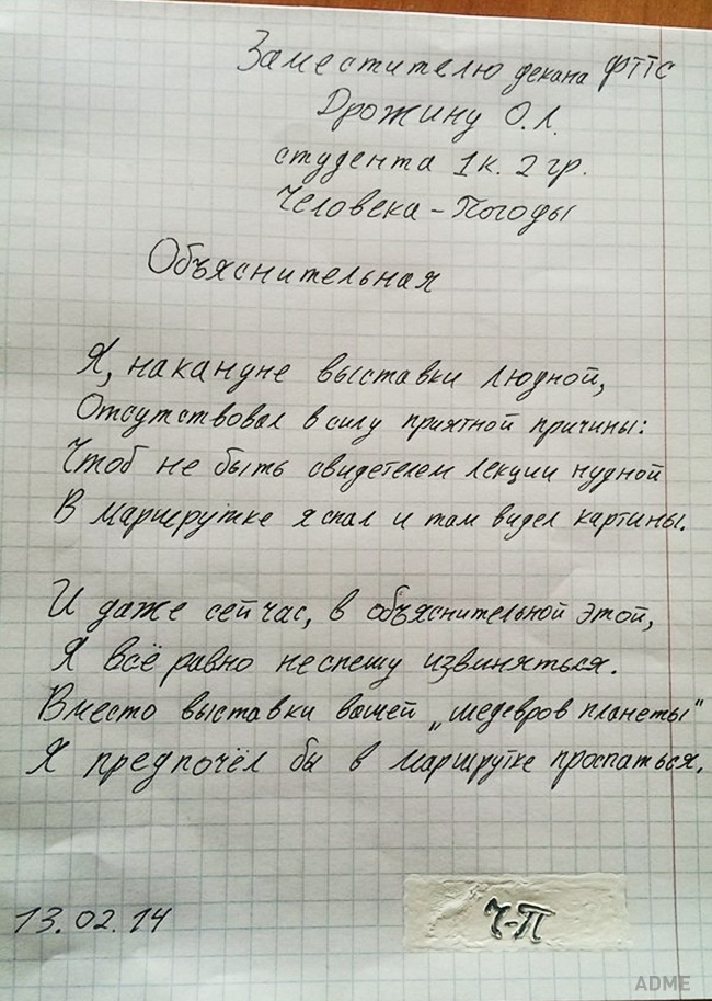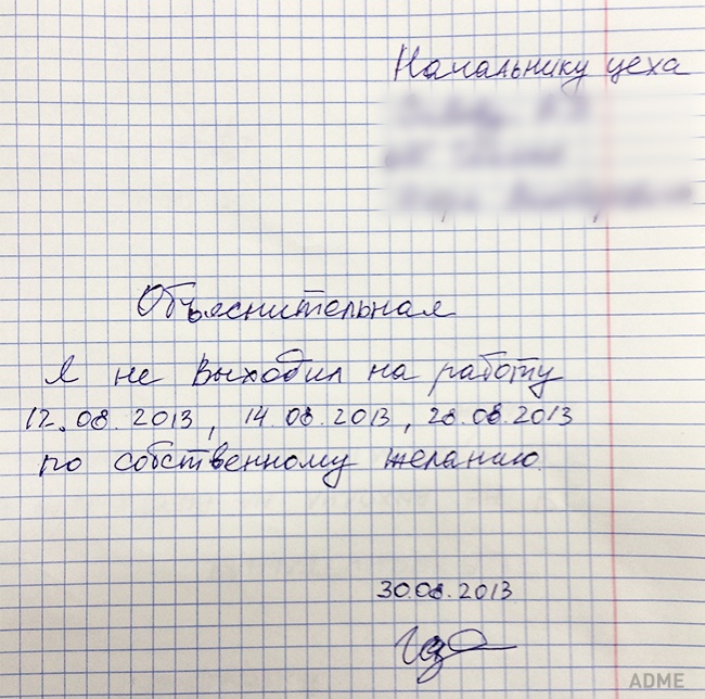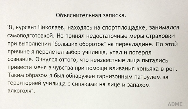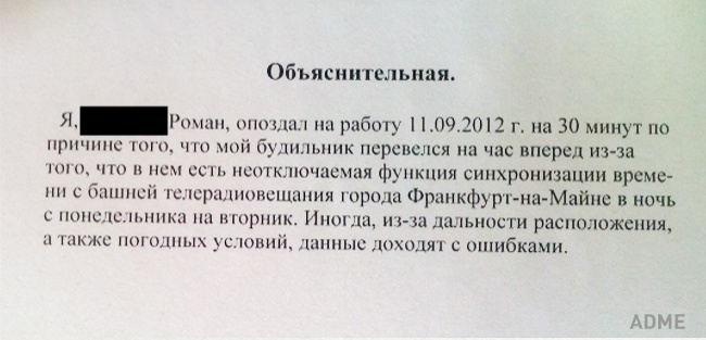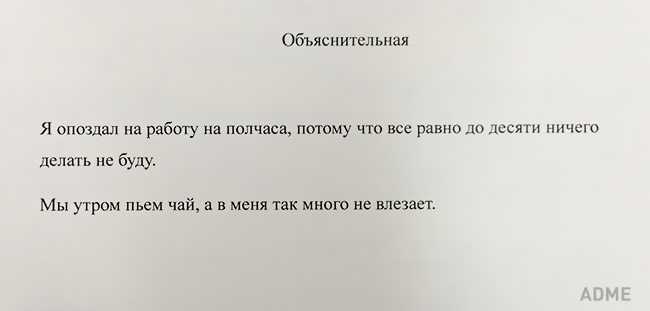 Нестандартне мислення і творчий підхід до ситуації є в кожній людині, і це доведено. Потрібен тільки відповідний момент, щоб вони проявилися. Наприклад, коли працівники запізнюються або не з'являються на роботу, їм відразу на допомогу приходить кмітливість. В результаті з'являються такі пояснювальні, які можна ставити в рамочку і всім показувати.