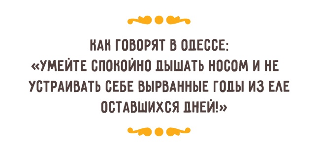 — Ой, я вас благаю! Мій Веня ходить туди не слухати! Веня ходить туди грати! - — Як тобі вдається ставитися до життя так спокійно?